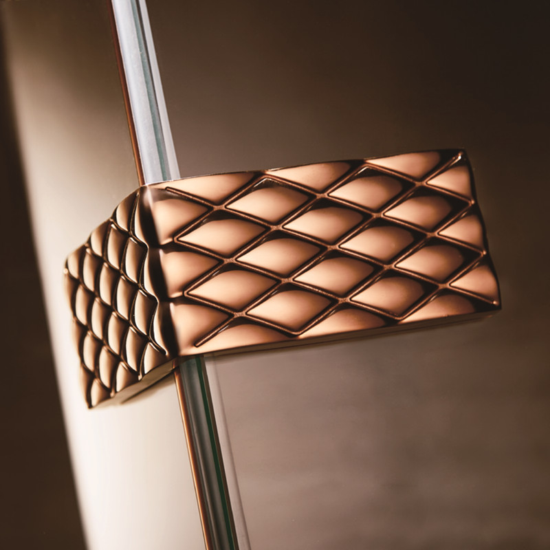 依托玫瑰金不銹鋼的完美演繹,襯托出超白玻璃的立面空間感和奢華點綴,完美再現(xiàn)了現(xiàn)代藝術(shù)的又一次靈感沖動,將簡潔的元素鑲嵌到了華美瑰麗之中,再次使視覺的沖擊如此微妙和平順。